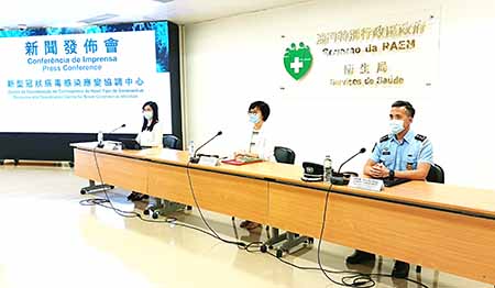 新型冠狀病毒感染應變協調中心昨日舉行記者會,旅遊局傳播及對外關係廳廳長劉鳳池、衛生局疾病預防及控制中心傳染病防控處處長梁亦好、治安警察局行動及通訊處處長馬超雄分別介紹本澳及鄰近地區整體防疫情況。