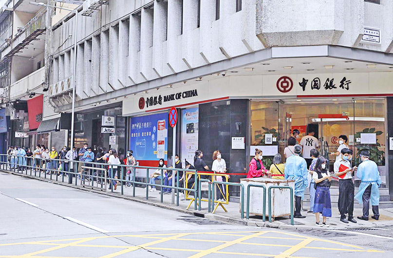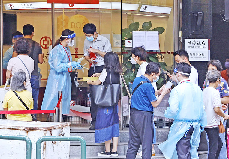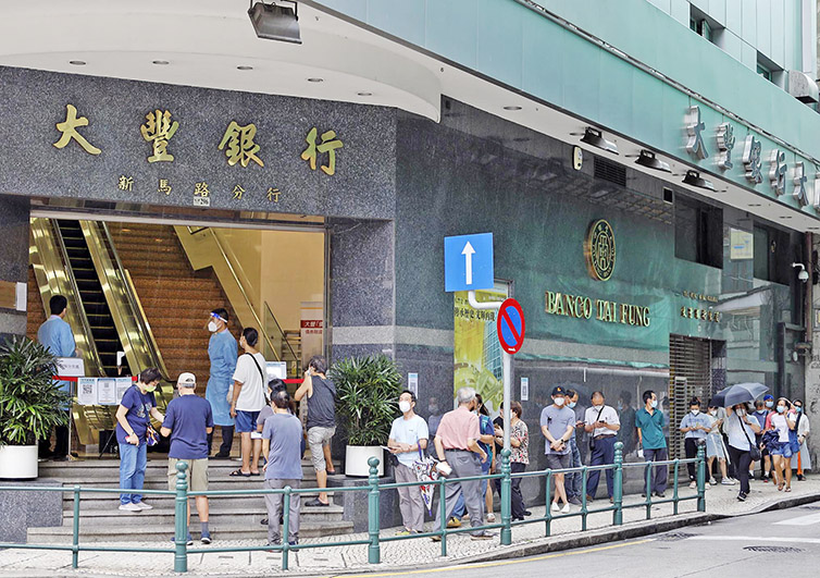 中銀澳門 9間支行提供有限度服務,上午在龍園支行,現場有近 50人排隊,有身穿防護服的工作人員協助維持秩序;海天居支行未營業前已出現排隊人龍,記者現場所見,有約 20、30人提早到場等候。