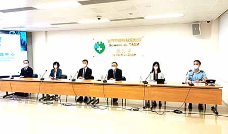 新型冠狀病毒感染應變協調中心昨日舉行記者會,衛生局仁伯爵綜合醫院醫務主任李偉成、教育及青年發展局非高等教育廳廳長張子軒、旅遊局傳播及對外關係廳廳長劉鳳池、衛生局疾病預防及控制中心傳染病防控處處長梁亦好、警察總局警務聯絡及公共關係處處長張健欣、治安警察局公共關係處處長李德輝分別介紹了本澳及鄰近地區整體防疫情況。
