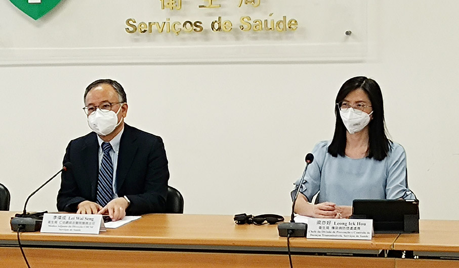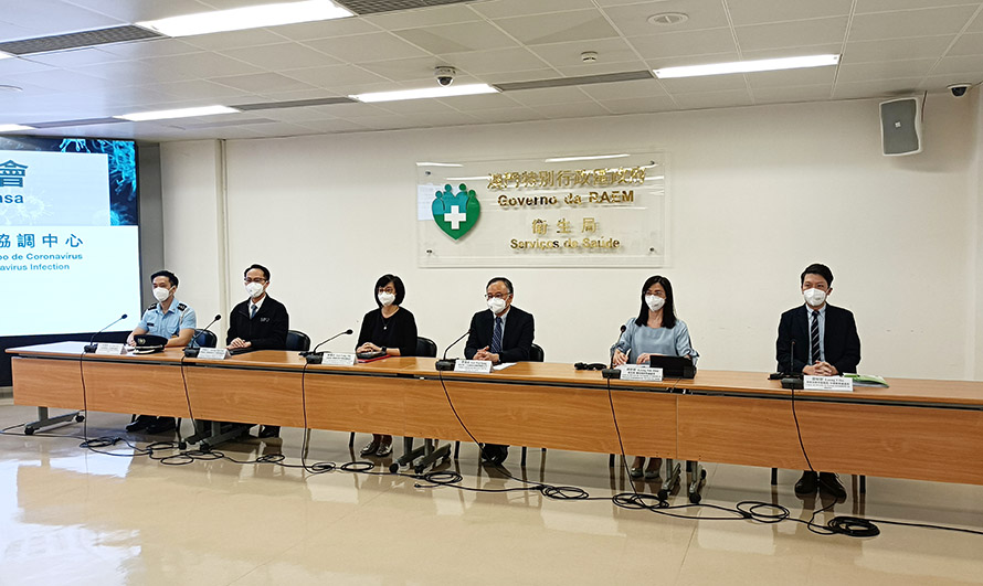 新型冠狀病毒感染應變協調中心昨日舉行記者會,衛生局仁伯爵綜合醫院醫務主任李偉成、旅遊局傳播及對外關係廳廳長劉鳳池、衛生局疾病預防及控制中心傳染病防控處處長梁亦好、教育及青年發展局中學教育處處長梁怡安、警察總局警務聯絡及公共關係處處長張健欣、治安警察局公共關係處處長李德輝分別介紹本澳整體防疫情況。