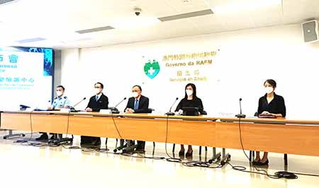 新型冠狀病毒感染應變協調中心昨日舉行記者會,衛生局仁伯爵綜合醫院醫務主任李偉成、衛生局疾病預防及控制中心傳染病防控處處長梁亦好、警察總局警務聯絡及公共關係處處長張健欣、治安警察局行動及通訊處處長馬超雄、旅遊局公共關係處處長藍同好分別介紹本澳的整體防疫情況。