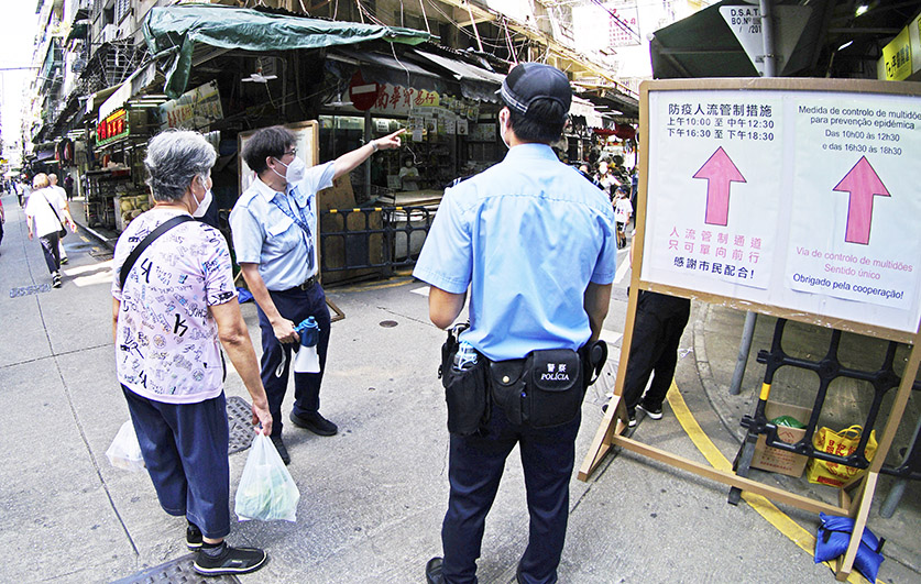 「鞏固期」第二日,市面人流大多集中在街市區域附近,其中義字街一帶有不少人到場買餸,現場實施人流管制,有警員和市政署人員駐守,提醒市民單向前行;沙梨頭街市同樣需實施人流管制,市民需排隊取籌,附近地段同樣人流眾多,有警員在場疏導交通和維持秩序。中區一帶人流不多,新馬路有個別珠寶店開門營業,天神巷地段有不少店鋪仍然關閉。部分理髮店門外出現排隊人龍。