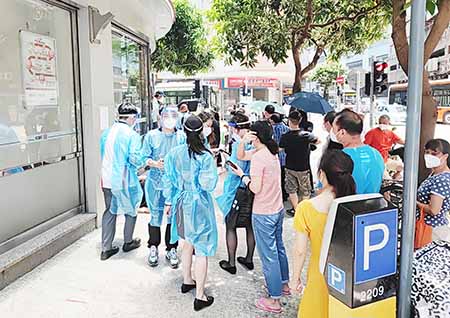 本澳銀行於防疫「鞏固期」提供有限度服務的第二天,昨日(二十六日)部分銀行增加營業網點,營業時間仍為中午十二時至下午互時。昨日早上近十一時,在高士德區有多間銀行門外,已有市民排隊等候,其中在紅街市中國銀行門外,已有數十名市民排隊,現場有穿著防護衣及面罩的工作人員指示市民排隊,分控人群。在新馬路中國銀行分行,有身穿防護衣的工作人員向排隊人龍派籌,提醒他們先行離開,並按籌時間到場辦理服務。在大西洋銀行和大豐銀行部分輪候人龍重疊,各在行人道左右兩邊排隊,令行人難以暢順通行,亦有行人因想避開人群,步出車道通過。