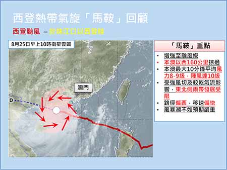 【特訊】氣象局於昨日傍晚六時三十分取消所有熱帶氣旋警告信號,颱風「馬鞍」昨日中午在廣東陽西至雷州一帶沿海登陸,「馬鞍」襲澳期間,本澳懸掛八號風球超過十二小時,氣象局總結時指出,由於「馬鞍」移速比預期快,且整體路徑和登陸位置較預期偏西,令風暴潮最大增水時間與天文潮高位錯峰,水浸情況沒預期嚴重。