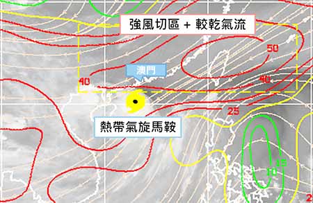 氣象局指出,一般而言,本澳以西登陸的熱帶氣旋,為本澳所帶來之影響,會較本澳以東登陸的熱帶氣旋明顯。然而,「馬鞍」在移近廣東沿岸過程中,雖然增強至颱風級別,但由於南海北部垂直風切較大,加上「馬鞍」東北側受較乾之氣流影響,使得其東北側的雲雨帶發展受限,主要強雨帶集中其南側,而本澳位處其北側,由於雲雨帶結構不對稱,截至昨日(二十五日)上午十一時,八號風球期間,本澳各區普遍只錄得約十毫米累積雨量。