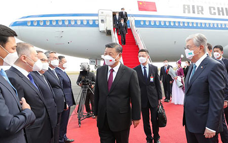 當地時間14日下午,習近平專機抵達努爾蘇丹國際機場時,哈薩克斯坦總統托卡耶夫率政府副總理兼外長特列烏別爾季、努爾蘇丹市市長庫裡吉諾夫等高級官員在機場熱情迎接。