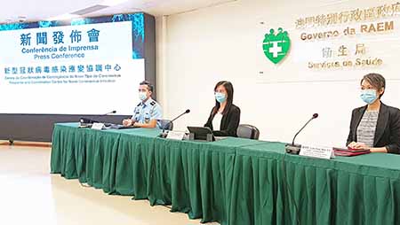 新型冠狀病毒感染應變協調中心昨日舉行記者會,衛生局疾病預防及控制中心傳染病防控處處長梁亦好、治安警察局行動及通訊處處長馬超雄、旅遊局公共關係處處長藍同好分別介紹了本澳的整體防疫情況。