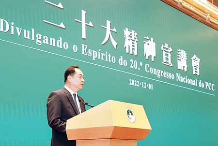 他提到,二十大對全面建設社會主義現代化國家進行戰略規劃,特別是提出以中國式現代化、全面推進中華民族偉大復興,明確高品質發展、高水準開放的方向,並強調推進粵港澳大灣區建設,支持港澳更好融入國家發展大局。為「一國兩制」下的澳門發揮優勢特點,實現更大的發展,注入強勁動力,提供廣闊空間。