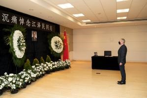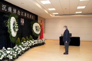 克勒希肅立默哀後在弔唁簿上留言說:“我代表聯合國大會,向中國前國家主席江澤民的家人以及中國政府和人民致以慰問。江澤民主席生前大力支持參與國際事務。在他的不懈努力下,中國不僅在國內取得成功,在聯合國也獲得了突出地位。我將懷念他。”