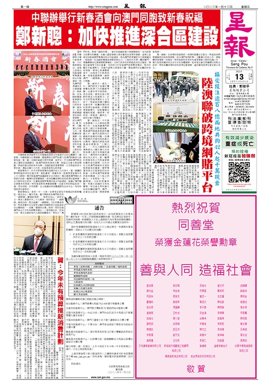 【特訊】中聯辦昨日舉行新春酒會,主任鄭新聰指出,當務之急是加快推進橫琴粵澳深度合作區建設,既為澳門經濟適度多元發展闖出一條新路,也為國家構建新發展格局出力。行政長官賀一誠表示,政府將根據國家防疫政策調整,結合澳門疫情形勢,不斷優化防疫工作,重點轉到保健康、防重症,特別做好長者和兒童等,重點人群的防護工作。