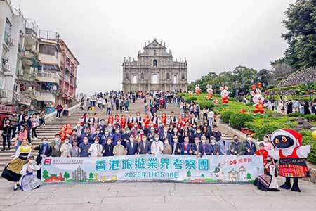 港澳免核檢通關後迎來首個香港旅遊業界考察團,約四十位香港旅遊業界領袖於昨早乘船抵澳展開兩天緊密行程,同行亦有十四位香港媒體代表。昨日下午,澳門經濟財政司司長李偉農聯同旅遊局局長文綺華等領導在大三巴牌坊與考察團合照。考察團一行於世遺景點感受澳門的中葡文化藝術表演:欣賞澳門原創歌曲「愛上澳門」、「澳門就是這樣」及葡萄牙土風舞蹈,澳門旅遊吉祥物「麥麥」亦於現場助慶,還有澳門中樂團在玫瑰堂的精彩演奏,及後一行到「澳品薈」及中國與葡語國家商貿合作服務平台展示館等地方參觀。經濟及科技發展局局長戴建業、文化局局長梁惠敏及澳門貿易投資促進局代主席余雨生等到場接待並與考察團成員交流。