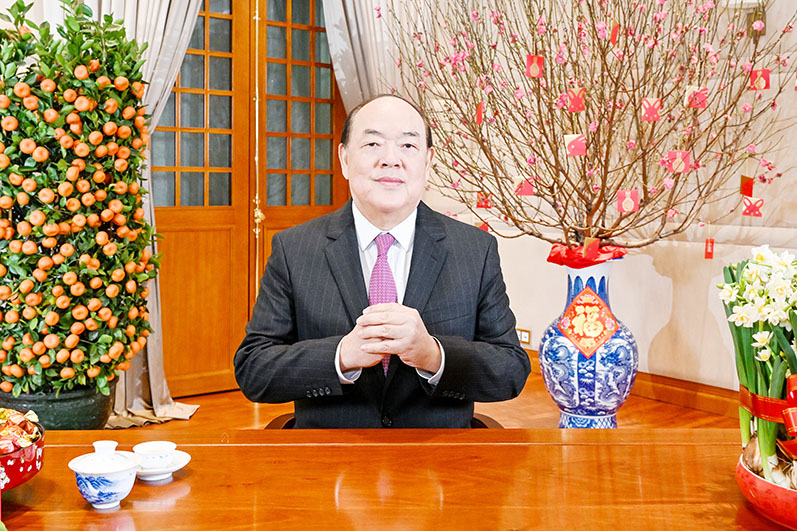 日月開新元,天地又一春。在這辭舊迎新、親友團聚的溫馨歡樂時刻,我謹代表澳門特別行政區政府,向全體澳門居民和一直以來關心支持澳門發展的朋友們拜年,祝大家新春吉祥,闔家幸福!