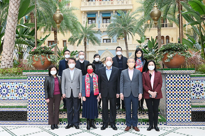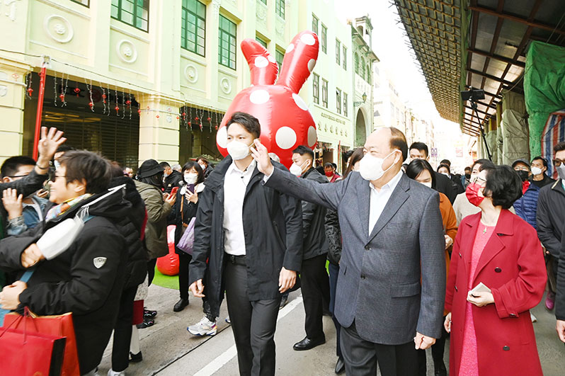 【特訊】新春期間,行政長官賀一誠伉儷先後走訪十月初五街、福隆新街、議事亭前地及新馬路一帶,沿途瞭解新春期間的商戶營運、居民出行和旅客人潮等情況,賀一誠伉儷並到訪六家綜合度假休閒企業,瞭解有關企業的非博彩元素設施、新春期間的營運情況,以及與現場的商戶、居民和旅客親切交談並送上新春祝福。