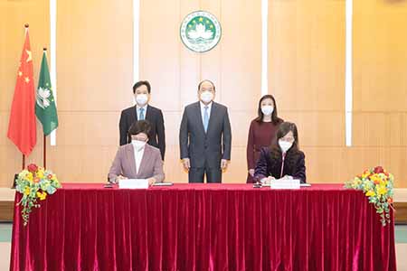 會面後,在行政長官、趙玉沛院士和國家衛健委港澳台辦副主任李維見證下,社會文化司司長歐陽瑜、北京協和醫院院長張抒揚於政府總部簽署《澳門特別行政區政府社會文化司與北京協和醫院合作協議》。