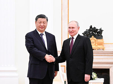 普京熱烈歡迎習近平對俄羅斯進行國事訪問,對習近平連任中國國家主席再次表示熱烈祝賀。普京表示,過去十年來,中國各方面發展都取得令世人矚目的偉大成就,這歸功于習近平主席的卓越領導,也證明瞭中國國家制度和治理體系的優越。我堅信,在習近平主席堅強領導下,中國必將繼續發展繁榮,順利實現各項既定宏偉目標。在雙方共同努力下,近年來俄中關係在各領域都取得了豐碩成果。俄方願同中方繼續深化雙邊務實合作,加強在國際事務中的溝通協作,推動世界多極化和國際關係民主化進程。