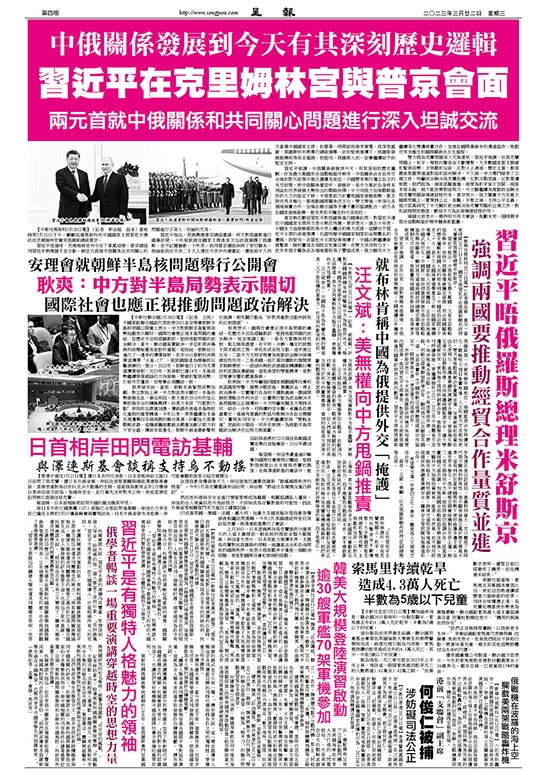習近平指出,很高興應普京總統邀請,再次對俄羅斯進行國事訪問。十年前我就任國家主席後首次出訪就選擇了俄羅斯,至今記憶猶新。十年來,我同普京總統保持了密切聯系。無論是我在中共二十大上連任中共中央總書記,還是前不久再次當選中國國家主席,你都第一時間給我發來賀電,我深表感謝。俄羅斯明年將舉行總統選舉。在你堅強領導下,俄羅斯發展振興取得長足進展。我堅信,俄羅斯人民一定會繼續給予你堅定支持。