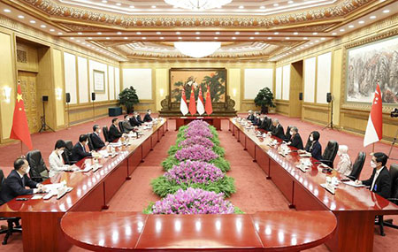 習近平指出,中新是重要合作夥伴,中新關係始終展現出前瞻性、戰略性、示範性,不僅有力推動了兩國各自發展振興,也為地區國家樹立了標桿。中方把新加坡置於周邊外交優先方向。你此次訪華期間,我們把中新關係提升為全方位高質量的前瞻性夥伴關係,為兩國關係未來發展指明了方向。中方願同新方加強戰略溝通,深化戰略對接,切實使“高質量”成為中新合作最鮮明的標識。
