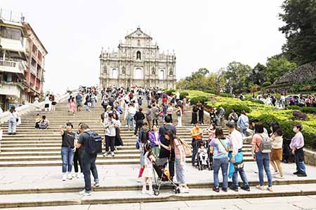 疫後首個復活節假期昨日正式展開,小城再次出現車水馬龍的盛況。下午抵澳旅客絡繹不絕,中區、大三巴等熱門旅遊景點人流熙來攘往,好不熱鬧。不少旅客打卡拍照,食肆和手信店門庭若市,警員巡邏維持秩序。