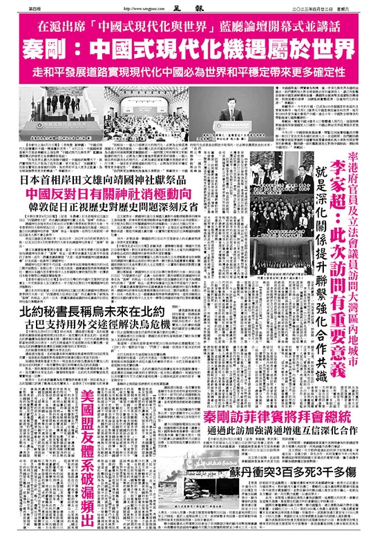 “我相信,一個人口規模巨大的現代化,必將為全球經濟復蘇注入更強勁動能;一個全體人民共同富裕的現代化,必將為各國共同發展開闢更廣闊路徑;一個物質文明和精神文明相協調的現代化,必將為人類社會進步開創更美好前景;一個人與自然和諧共生的現代化,必將為建設清潔美麗世界提供更可行方案;一個走和平發展道路的現代化,必將為世界和平穩定帶來更多確定性。”秦剛說。