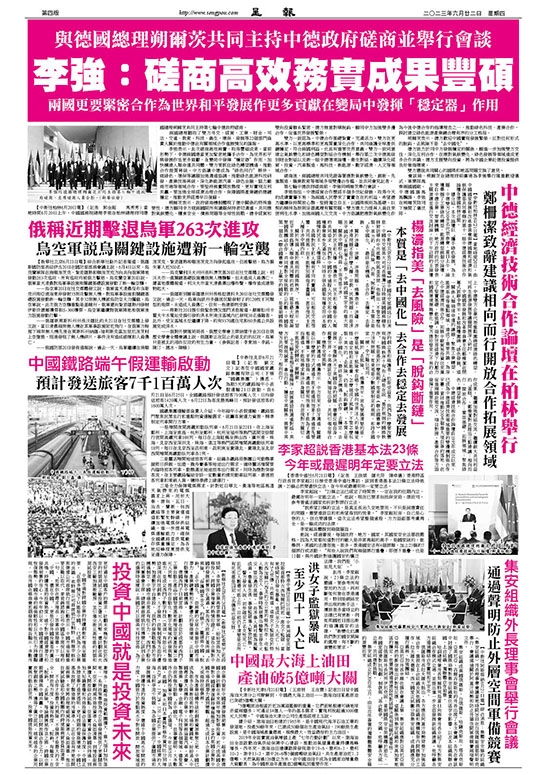 李強表示,此次磋商高效務實,取得豐碩成果。當前形勢下,中德兩國應當更加緊密地攜手合作,為世界和平與發展作出更多貢獻,在變局中發揮“穩定器”作用,加快構建人類命運共同體。雙方要抓住綠色轉型機遇,推動合作提質昇級。中方倡議中德成為“綠色同行”夥伴,就綠色、環保等議題加強溝通協調,推動綠色能源科技研發、產業技術昇級,深化新能源汽車、綠色金融、協力廠商市場等領域合作。要堅持務實開放態度,更好實現互利共贏。要加強全球經濟治理合作,保障國際產業鏈供應鏈穩定,推動世界經濟早日復蘇。