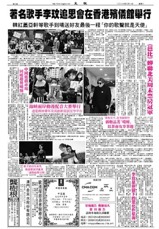 【香港中通社7月31日電】(作者 陳偉根)“你是永恆”,“你的歌聲就是天使”,“永遠懷念”,7月31日下午,本月5日去世的著名歌手李玟(CoCo)追思會在香港殯儀館舉行。韓紅、蕭亞軒等歌手到場,送好友最後一程;靈堂內李玟的遺照,笑容如天使,永恆凍結在此,像在迎接每一位來悼念她的朋友。