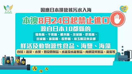 日本宣佈將於近日排放福島核污染水入海,特區政府對此表示強烈不滿。為保障本澳的食品安全和居民健康,特區政府將採取必要的措施,從二零二三年八月二十四日(明日)起禁止進口源自福島縣、千葉縣、櫪木縣、茨城縣、群馬縣、宮城縣、新潟縣、長野縣、埼玉縣及東京都共十個都縣區的鮮活食品、動物源性食品、海鹽及海藻,包括蔬菜、水果、奶及奶制品、水產及水產製品、肉類及其製品、禽蛋等。