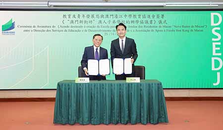 澳門濠江中學教育協進會表達有意願承辦該所學校,並正向深合區各相關權限部門落實辦學的相關程序。為創設條件使就讀該所澳人子弟學校的澳門學生享有趨同於澳門免費教育的待遇,參照澳門學校加入免費教育學校系統的做法,教育及青年發展局與澳門濠江中學教育協進會簽署《「澳門新街坊」澳人子弟學校的辦學協議書》。