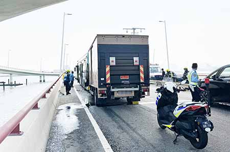 【特訊】友誼大橋往氹仔方向,昨日中午發生三車相撞的交通意外,一輛巴士在等候交通燈期間,被後方貨車追尾撞到,巴士再被推向前方旅遊巴,事件中十一人受輕傷送院。治安警經調查後初步懷疑,貨車與前車沒有保持安全距離引致事故。