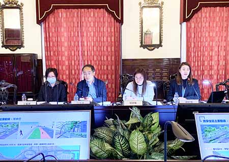 澳門半島南岸海濱綠廊(第二期)設計方案新聞發佈會假市政署大禮堂舉行,市政署道路渠務廳廳長何萬謙、設施維修處處長胡詩敏、設施維修處建築師梁昕彤出席介紹詳情。