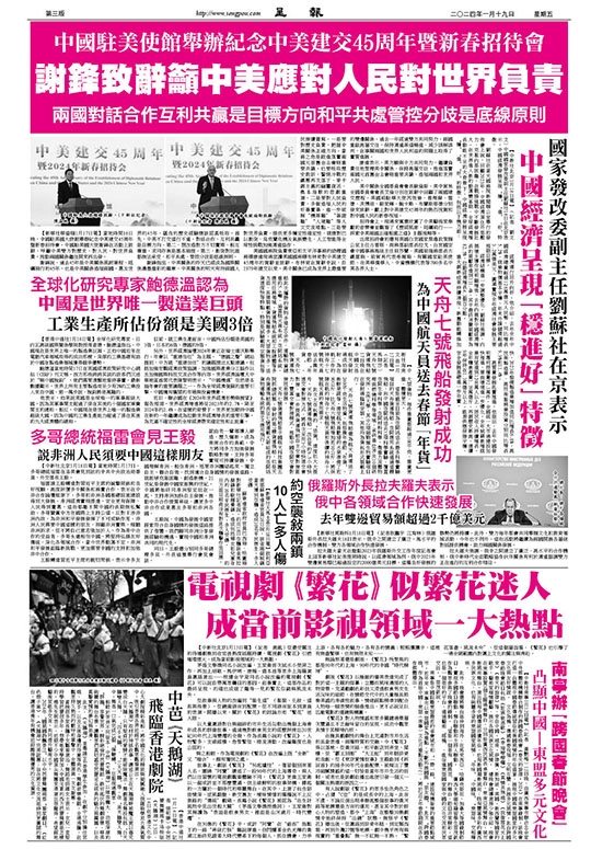 【新華社華盛頓1月17日電】當地時間16日晚,中國駐美國大使館舉辦紀念中美建交45周年暨新春招待會。中國駐美國大使謝鋒在活動上致辭,呼籲中美雙方對歷史、對人民、對世界負責,推動兩國關係繼往開來再出發。