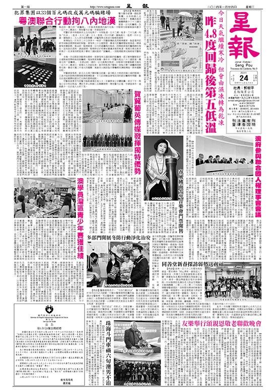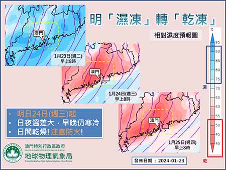氣象局表示,昨日早上大潭山氣象站錄得最低氣溫攝氏四點八度,是今年入冬以來最低氣溫,亦是回歸後有記錄以來,一月份第五低的氣溫。氣象局稱,影響本澳的強冷空氣將於今日(二十四日)持續影響本澳,今日早上晚氣溫仍維持嚴寒水平,今日清晨最低氣溫與昨日相若或稍低,但天氣將由「濕凍」轉為「乾凍」,氣溫約為攝氏五至十二度,橙色低溫提示仍然生效。