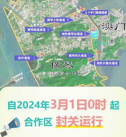 【特訊】橫琴粵澳深度合作區執行委員會與廣東省人民政府橫琴粵澳深度合作區工作辦公室昨日(二月八日)聯合發佈通告,根據《橫琴粵澳深度合作區建設總體方案》(以下簡稱《總體方案》)《橫琴粵澳深度合作區總體發展規劃》,經管委會研究同意,自三月一日零時起合作區正式封關運行。這是實現合作區第一階段發展目標的標誌性舉措,也是推動琴澳一體化發展的重要一步。