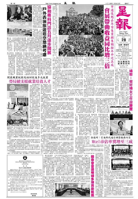 另外,據統計暨普查局資料顯示,2023年本澳零售市道復甦,全年零售業銷售額按年上升49.5%至862.5億元(澳門元,下同),較2019年亦上升11.7%。與2022年比較,受惠於訪澳旅客增加,中式食品手信的全年銷售額躍升3.4倍,鐘錶珠寶、皮具、百貨和成人服裝亦分別上升79.5%、74.2%、68.9%及61.6%,通訊設備則下跌18.6%。