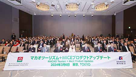 澳門「旅遊+會展」最新產品資訊推介會及洽談會昨日(六日)在東京皇宮酒店舉行。澳門旅遊局局長文綺華、日本旅行業協會海外旅行推進部國際中心所長伊東和宏、澳門貿易投資促進局行政管理委員會執行委員李藻森、橫琴粵澳深度合作區經濟發展局文旅會展商貿處處長林衍傑、澳門航空股份有限公司日本支社副支社長兼大阪支店長陳振強等嘉賓,聯同澳門旅遊業界和六大綜合度假休閒企業代表等超過二百一十人出席洽談會。