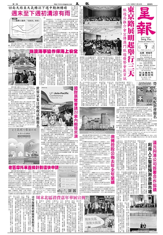 【特訊】旅遊局鋪開國際市場的宣傳,今年首個大型路展活動將於三月八日一連三天於日本東京舉行。旅遊局攜同澳門旅遊業界前往日本,率先在昨日(六日)於當地舉辦澳門「旅遊+會展」最新產品資訊推介會及洽談會,讓日本旅客和當地業界加深認識澳門旅遊優勢及嶄新會展資訊,開拓國際客源市場。