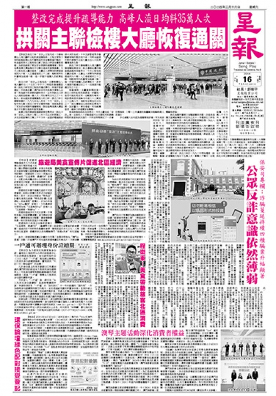 另外,對於拱北口岸主聯檢樓出入境大廳恢復通關,本澳旅遊局副局長許耀明認為,改造後能讓旅客更便捷和更舒適通關,為旅遊城市帶來正面作用,而當局在關閘亦設有旅客諮詢處,將留意人流量會否增加。