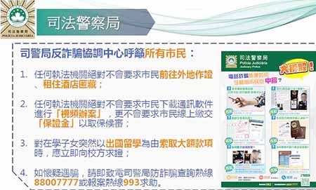 司警呼籲市民提防,稱任何執法部門絕不會要求居民前往外地作證,租住酒店匿藏。