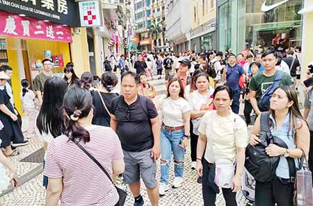 內地一連三天(四日至六日)的清明節小長假昨日(四日)開始,昨日下午在中區旅遊景點大三巴一帶,人流絡繹不絕,往大三巴路段人頭湧湧。有江門的旅客表示,已在澳旅遊數天,反映清明節中區酒店房價貴一百至二百元;有大三巴手信店負責人反映,雖然區內旅客明顯增多,不少旅客被擠在人潮中,難以進店消費,生意額比平日少近半;另一手信店負責人則滿意銷情,蛋撻等商品一早沽清,生意額較剛過去的復活節假期上升兩至三成,較平日則增加幾倍。