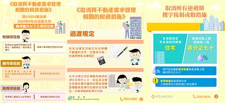 【特訊】經持續關注及評估不動產市場情況,因應不動產市場環境的變化,特區政府提案並獲立法會審議及通過第5/2024號法律《取消與不動產需求管理相關的稅務措施》,自四月二十日起全面取消涉及不動產的三項印花稅,包括特別印花稅、額外印花稅及取得印花稅。樓宇按揭方面,澳門金融管理局透過發出新指引,自該日起取消逆週期樓宇按揭成數措施,並暫停實施壓力測試的要求。