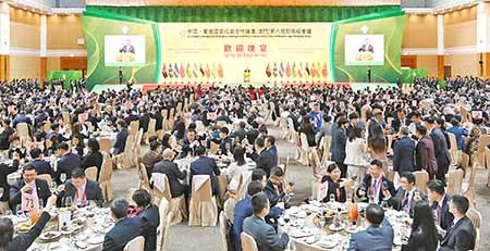 中葡論壇(澳門)第六屆部長級會議歡迎晚宴於昨日晚上在東亞運動會體育館國際會議展覽中心舉行,約八百五十人參與,全國人大副委員長李鴻忠、全國政協副主席何厚鏵、澳門中聯辦主任鄭新聰,以及九個葡語國家的代表團人員等出席。
