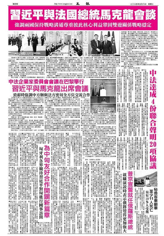 馬克龍表示,今年法中將共同隆重慶祝法中建交60周年。法中關係友好,合作富有成效,不僅涉及高尖端技術,也包括氣候變化、海洋多樣性等全球性議題。習近平主席訪問期間,雙方簽署多項合作協議,再次彰顯法中合作的潛力和前景。當前,世界面臨諸多緊迫挑戰,法中關係處於承前啟後的關鍵時刻。法中關係具有深厚底蘊,雙方相互尊重,著眼長遠,加強合作,將為解決全球性挑戰、避免集團對立對抗發揮重要積極作用。法方希望同中方進一步密切雙邊經濟關係和多邊溝通協作,推動法中戰略伙伴關係取得更多成果。法方希望向中國出口更多農產品,同時將對中國保持市場開放,不會針對中國企業搞歧視性政策,歡迎更多中國企業包括高技術企業赴法投資合作。法方願同中方加強航天航空、民用核能等領域合作,共同辦好今年法中文化旅遊年活動,歡迎中方派團出席巴黎奧運會。法方願就氣候變化、生物多樣性保護、人工智能等全球性問題同中方密切溝通合作,共同維護多邊主義、聯合國憲章宗旨和國際法。