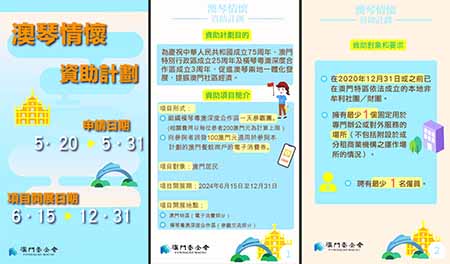 【特訊】為慶祝中華人民共和國成立75周年、澳門特別行政區成立25周年及橫琴粵澳深度合作區成立3周年,促進澳琴兩地一體化發展,提振澳門社區經濟。澳基會推出“澳琴情懷資助計劃”,資助合資格社團組織橫琴深合區一天參觀團和派發在澳門使用的電子消費券。資助計劃於2024年5月20日至31日接受申請。