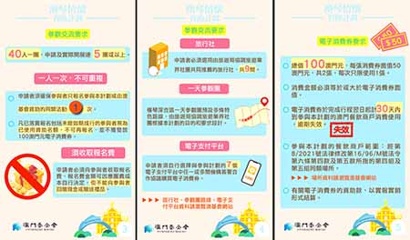 每名澳門居民只可報名參加一次上述活動或由澳基會資助的同類型活動(包括深合區參觀交流和派發電子消費券)。參與行程居民可獲發2張面值為50澳門元的電子消費券於指定的澳門餐飲商戶使用,每次消費限用1張。電子消費券於完成參觀團行程翌日起計30天內使用,逾期失效。凡已報名但未如期參團的居民將不獲發電子消費券,並視為已使用資助名額。