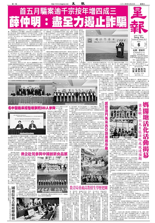 薛仲明致辭時表示,社會治安形勢複雜多變,今年1月至5月,司警局開立各類案卷共5,907宗,同比增加28.8%;刑事專案調查及檢舉共3,214宗,按年增加28.3%。完成案卷5,100宗,按年增加23.3%。移送司法機關人數1,396人,按年增加57%。今年以來,本澳沒有發生殺人、綁架等案件,嚴重犯罪繼續維持低案發趨勢,社會治安依然保持穩定,犯罪形勢總體可控。但是,與博彩業、旅遊業有關的犯罪上升,詐騙和資訊罪案遞增趨勢持續,司警局將繼續加強防打相關犯罪,維護公眾財產安全和合法權益。