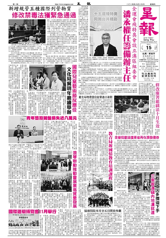 因此,昨日亦刊登第136/2024號行政長官批示,設立第十五屆全國運動會及全國第十二屆殘疾人運動會暨第九屆特殊奧林匹克運動會澳門賽區籌備辦公室。籌備辦公室屬項目組性質,且直屬社會文化司司長並在其指示下運作。