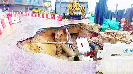 稍後,於同日早上九時許,新城A區濠江圓形地附近的封閉路段出現路陷,消防表示,現場無人員或車輛墮下,該局就事件沒有接獲相關求助。路陷現場約三米深,範圍約六米長乘六米寬,現場屬封閉路段,對公共道路沒有影響。消防到場了解後,通知現場負責人對路陷地面做圍封工作。
