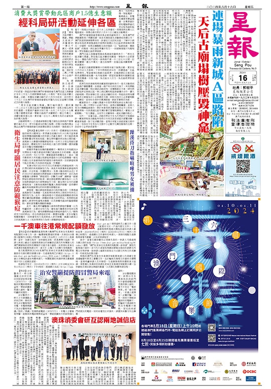 其中在昨日早上七時許,漁翁街天后古廟有古樹倒塌,壓到廟宇戶外空間一個混凝土神龕,文化局與市政署隨即派員到現場瞭解情況,經初步檢查,懷疑因古樹日漸轉弱,加上多場強降雨所致,事件中無人受傷,廟宇主體建築未有受損。文化局局長梁惠敏表示,事件屬於不幸,相信因天氣及古樹自身情況所致,後續會為受損的神龕和扶手安排修復工作,並同市政署持續監測、跟進古樹的情況。