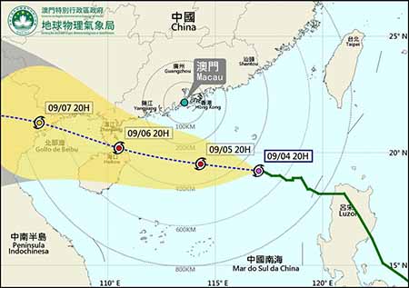 氣象局表示,位於南海北部的強颱風「摩羯」正緩慢向西北偏西移動,預料週末趨向廣東西岸至海南島一帶。與「摩羯」相關的環流明日開始影響珠江口,本澳日間風力將會逐步增強,雷雨漸趨頻密。按照現時預測路徑,隨著「摩羯」有機會進一步增強為超強颱風,並於週四後期在本澳以南約三百公里範圍內掠過,屆時本澳風力將顯著快速增強,有頻密的大驟雨及雷暴,今日晚間發出八號風球的機會中等至較高。