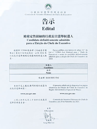 行政長官選舉管理委員會早前表示,澳門特別行政區維護國家安全委員會已審查通過被提名人擁護《澳門特別行政區基本法》和效忠中華人民共和國及其澳門特別行政區的資格,管委會於九月十七日完成對被提名人的可接納審查,並按《行政長官選舉法》的相關規定,完成審查並公佈有關決定,在水坑尾街公共行政大樓地面層張貼載有被接納的被提名人姓名及為其作出提名的三百八十六名行政長官選舉委員會委員姓名之告示,上載至行政長官選舉網頁。