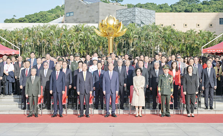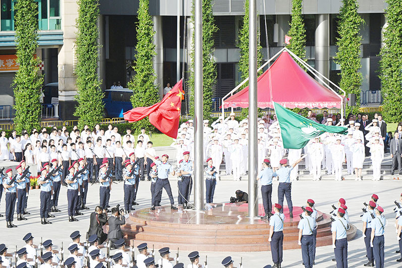 特區政府於昨日早上八時在金蓮花廣場舉行隆重的國慶日升旗儀式, 行政長官賀一誠在保安司司長黃少澤陪同下,進場並檢閱儀仗隊,現場奏起國歌。國旗和區旗緩緩升起。出席觀禮的人員包括特區政府主要官員、立法及司法機構負責人、行政會委員、立法議員、中央駐澳機構官員及社會各界代表等,共五百九十五人出席。升旗儀式亦吸引不少市民到場觀看。